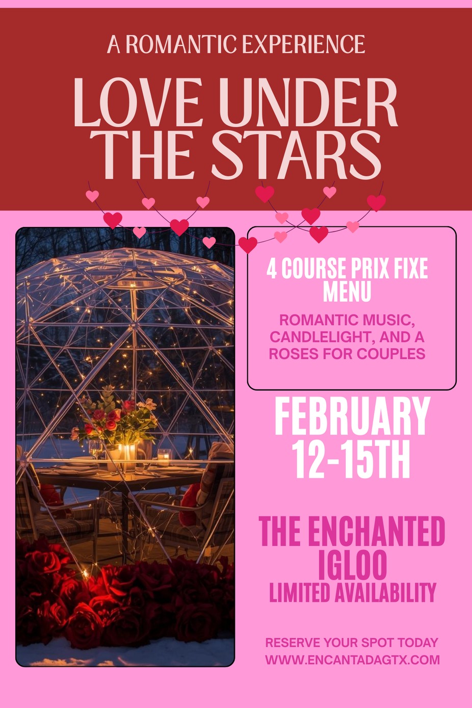This is our coursed menu for our igloo experience. During the dining under the stars, there will be a 4 course menu with board games to enjoy with the family. Come enjoy this holiday season with Encantada !